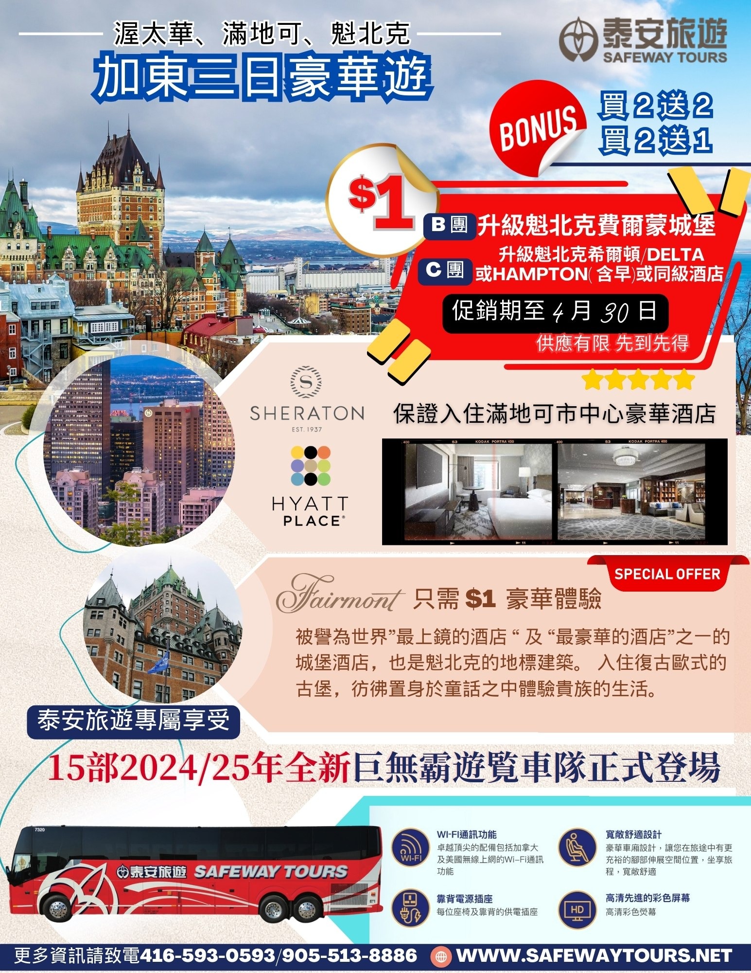 - D買2送2/1優惠 - 滿地可:(免費升級) 4星市中心喜來登/Hyatt Place 酒店或同級 | 魁北克: 3星品牌 (距離古城15分鐘車程)Comfort inn /Quality 或同級酒店